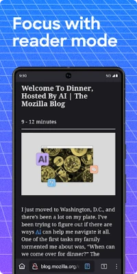 • Private browser mode — Search in a private tab, and your browsing history is automatically deleted from your device when you close Firefox.