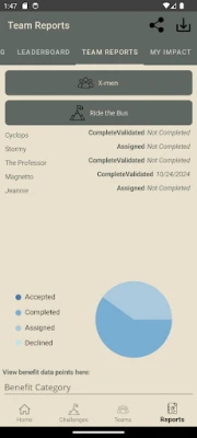 Benefits of completing challenges accumulate and show you your contributions per category as well as those by the teams you join.